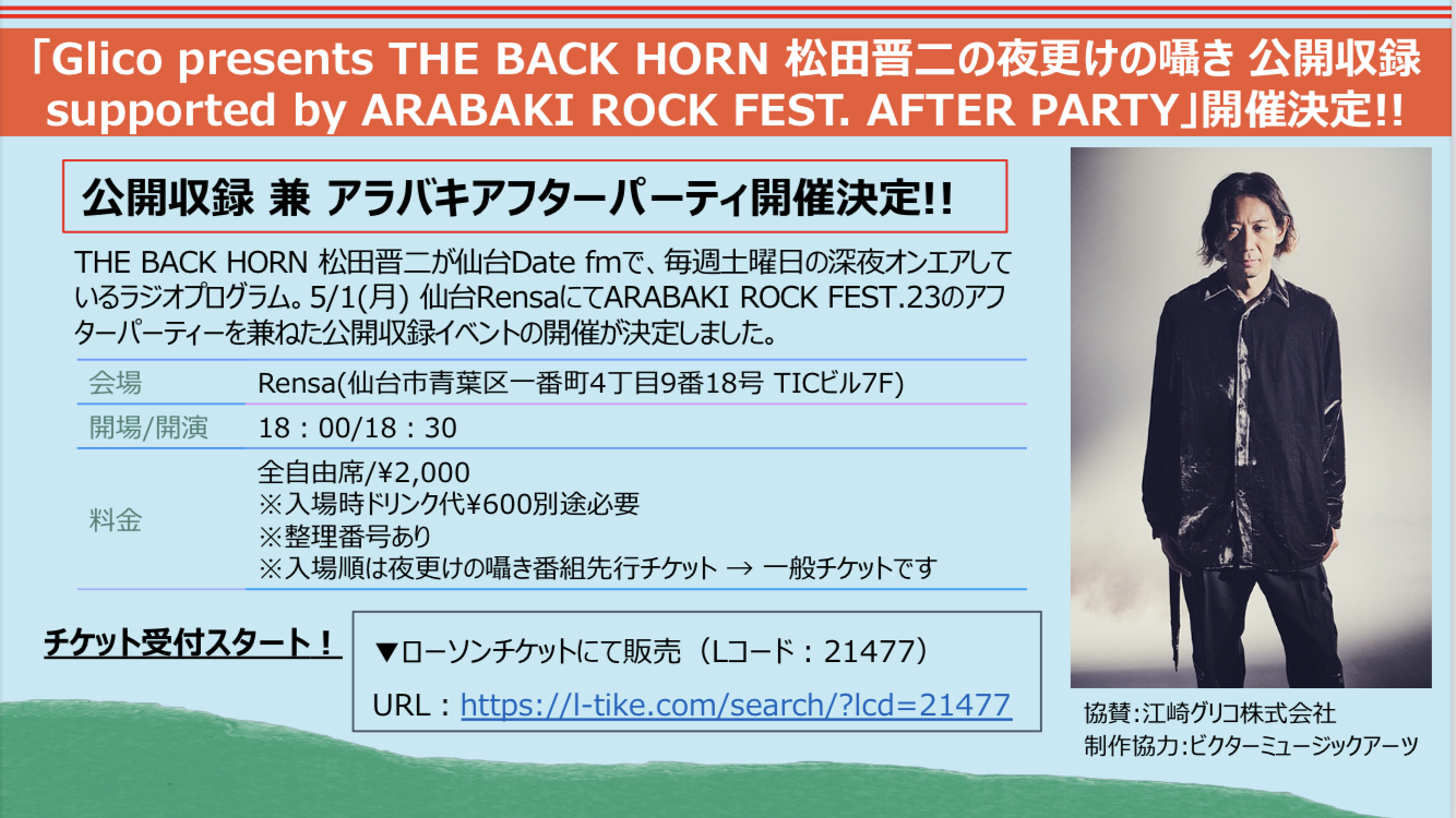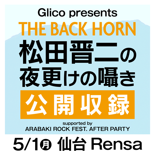 NEWS[松田晋二]「Glico presents THE BACK HORN 松田晋二の夜更けの囁き 公開収録 supported by ARABAKI ROCK FEST. AFTER PARTY」開催決定!2023.03.22