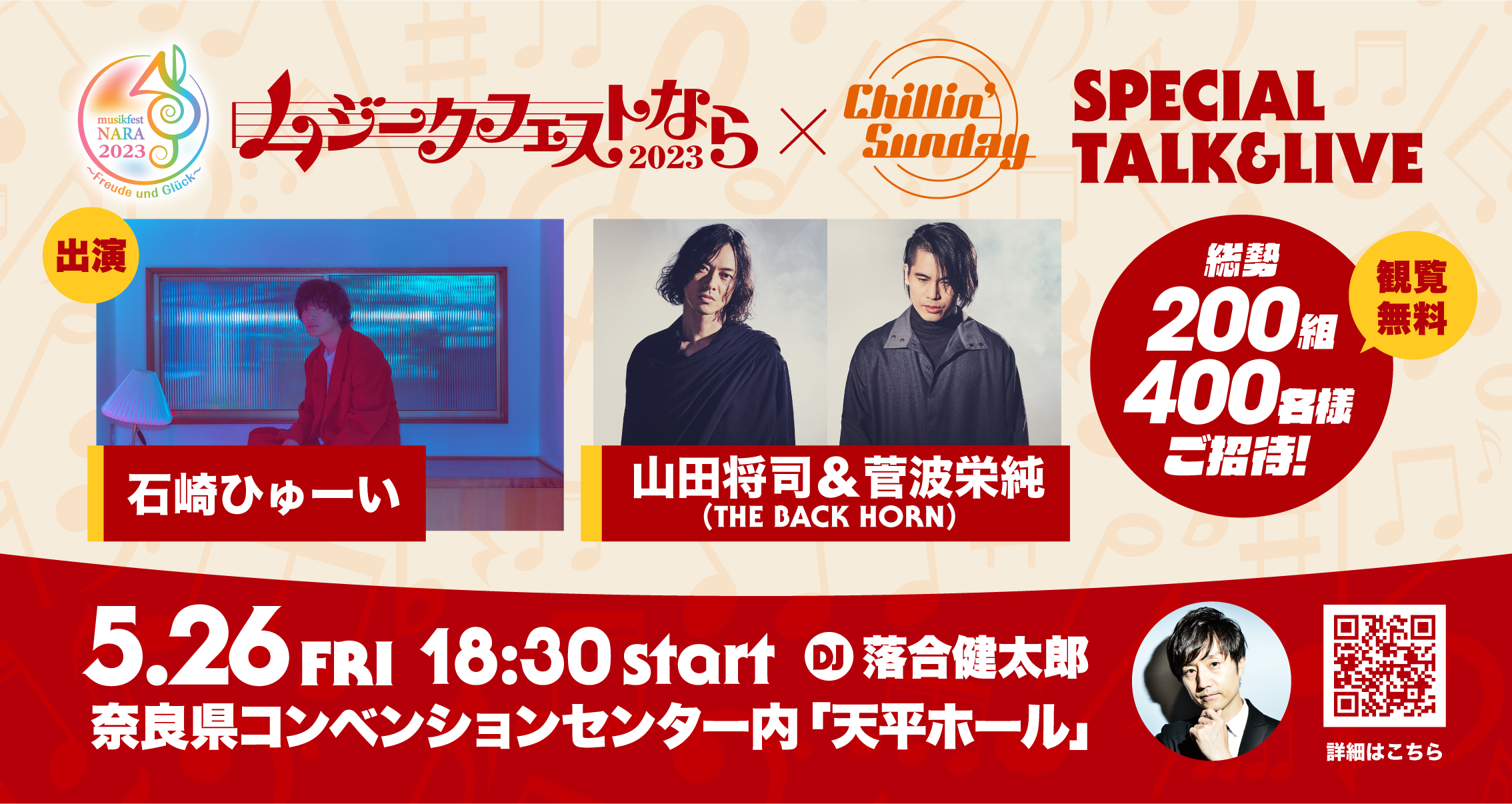 NEWS「ムジークフェストなら 2023 × FM802 「Chillin'Sunday」 SPECIAL TALK & LIVE」山田将司、菅波栄純出演決定!2023.03.24