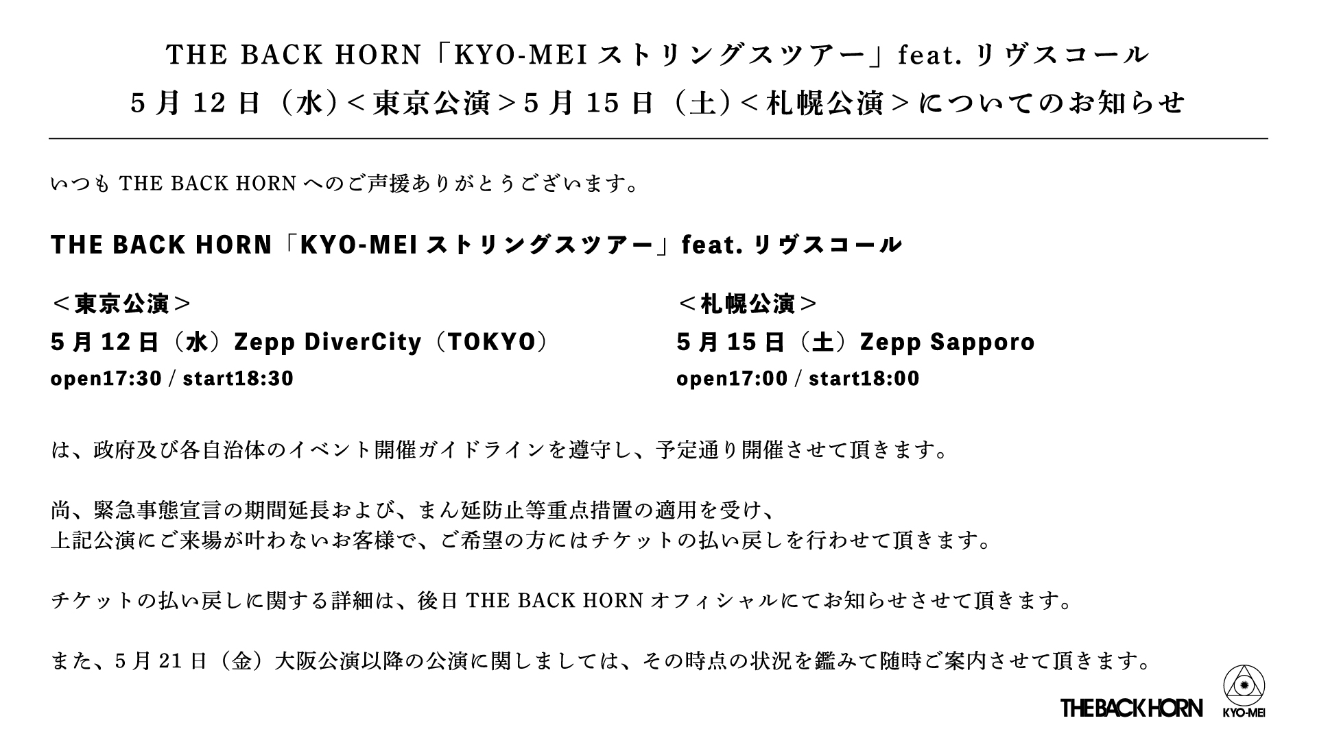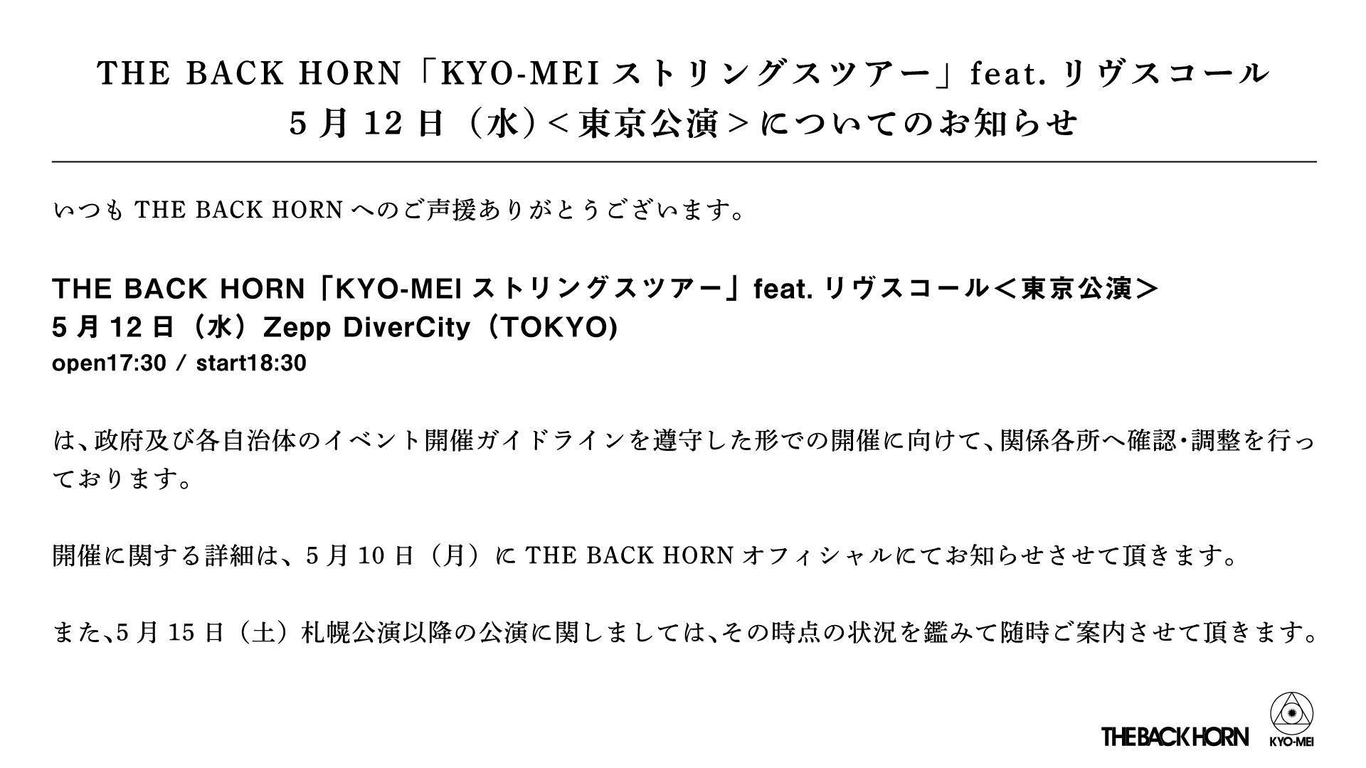 NEWS【THE BACK HORN「KYO-MEIストリングスツアー」feat.リヴスコール】5月12日(水)<東京公演>についてのお知らせ2021.05.08