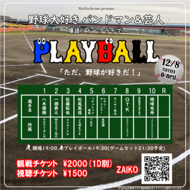 NEWS野球大好きバンドマン&芸人 爆語りトークライブ PLAYBALLに岡峰光舟が出演!2020.12.03