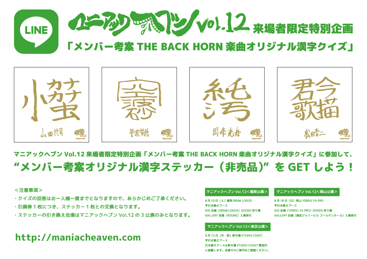 NEWSマニアックヘブンVol.12来場者限定特別企画「メンバー考案THE BACK HORN楽曲オリジナル漢字クイズ」実施!2019.08.08